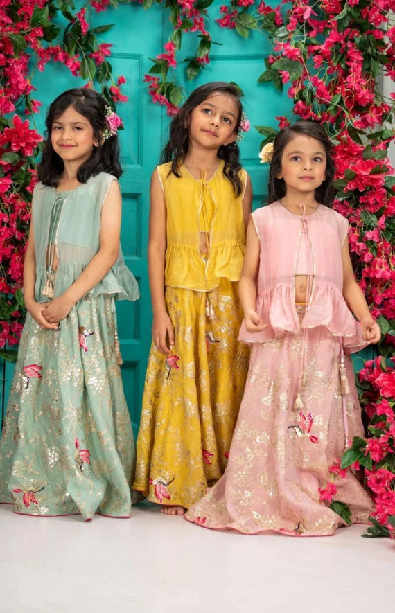 All over embroidered chanderi ghagra with pink bird embroidered all over, a corset with smocking elastic at the back with spegetti straps and sleeveless organza jacket, three piece set