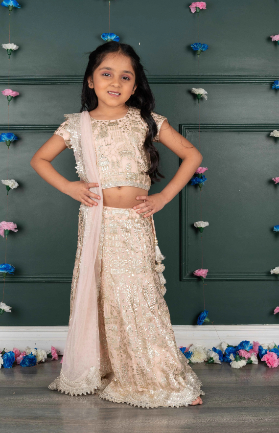 Ghagra Choli with beautiful zari foil like fine threadwork embroidery in a jungle theme.