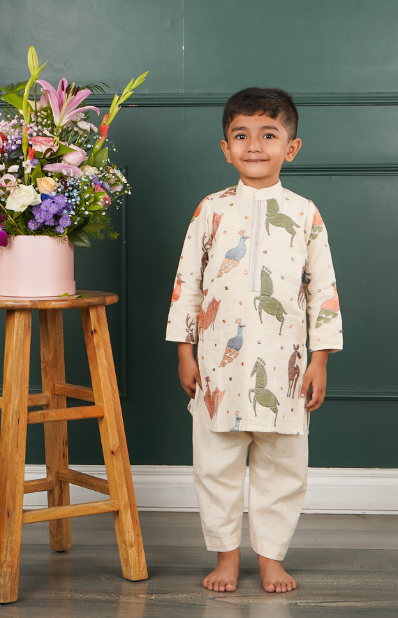 The Kurta and Salwar Set is a delightful outfit crafted from soft linen cotton and mal fabric. The cream kurta is adorned with charming bold animal motifs, adding a playful and elegant touch, and is paired with a comfortable salwar.