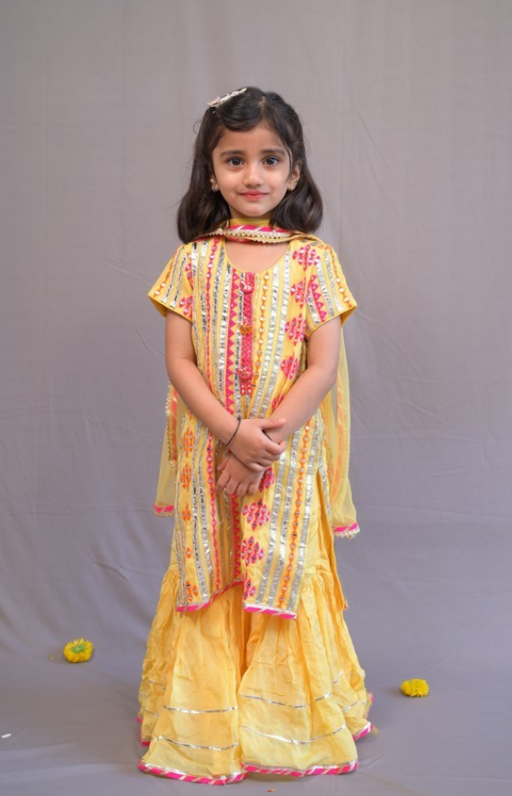 A beautiful multi-coloured embroidered yellow kurta with ethnic colours like rani, orange and silver gota embelishment. It is paired with a beautiful net dupatta with gota chakri on the border and a crepe chinon sharara with silver gota chakri egding. Also has a mirror work on kurta.