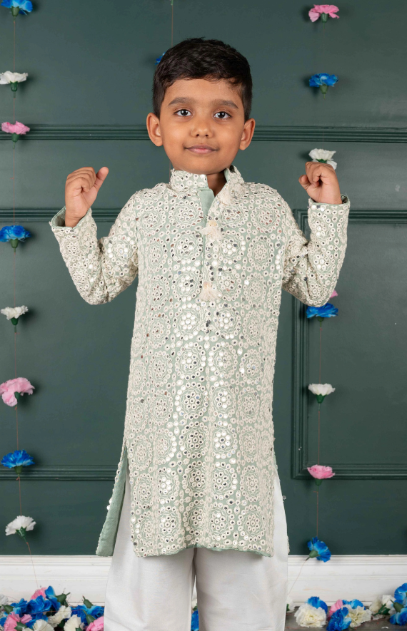 It’s a Kurta set with Amla/mirror work all over & cream threadwork, accompanied with a cream salvar.