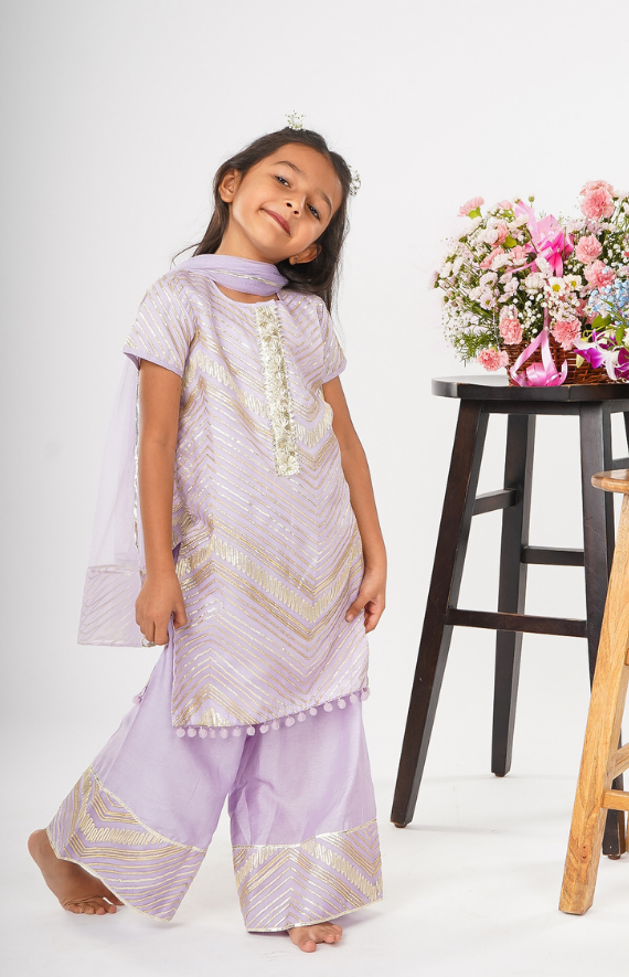 A beautiful Organza Kurta with Soft Chantone Lining with Zigzag Gota Work on the kurta. Complemented with silk pallazo with gota work on the borders of the pyjama, with a net dupatta.