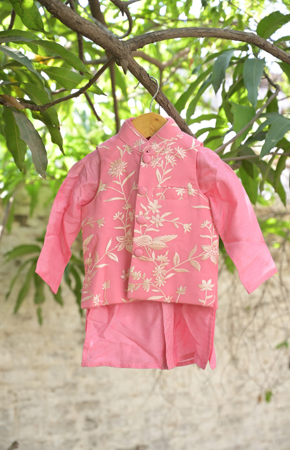 It’s a 3 piece kurta jacket Set. Where the jacket is fully embroidered with parsi gara embroidery. The kurta inside is of pure silk with parsi gara embroidery on the collar and patti with a cream salvar.