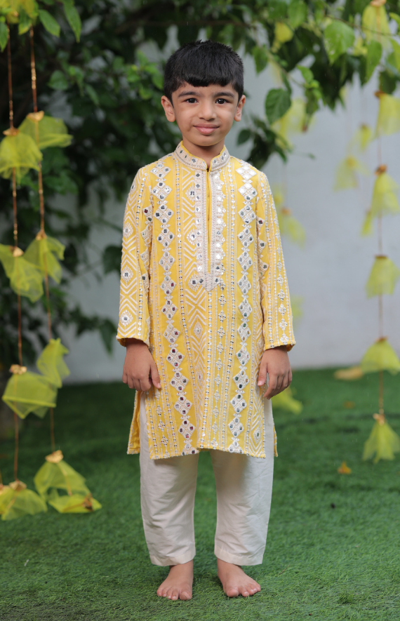 The Sitara Collection for boys has beautiful mirror like embroidery in a lucknowi style with cream threadwork and Amla which gives a mirror look but is super soft. It is complemented with an embroidered kurta patti. The set has a Kurta and a cream cotton silk salwar.