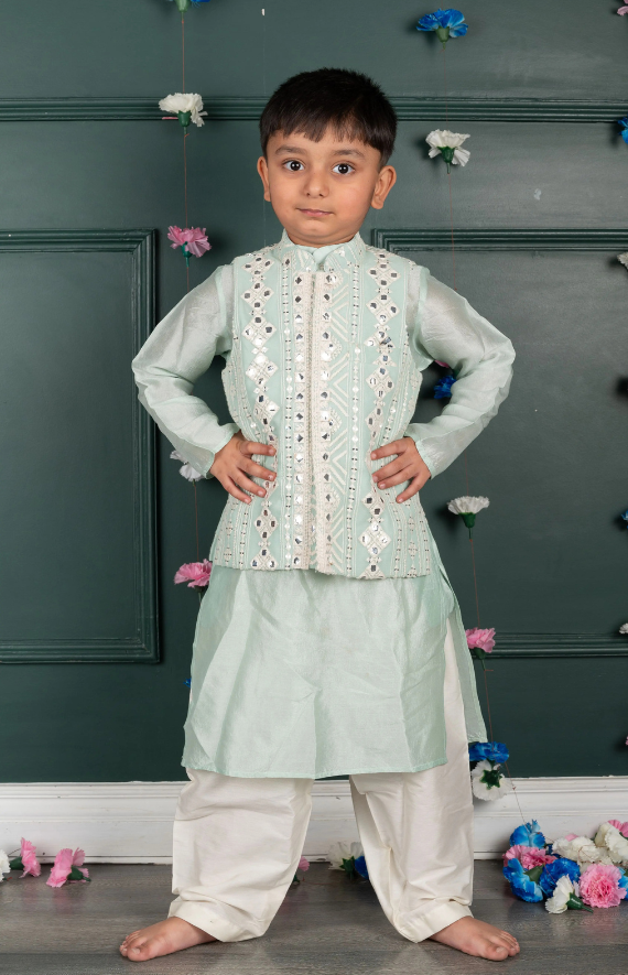 The Sitara Collection for boys has beautiful mirror like embroidery in a lucknowi style with cream threadwork and Amla which gives a mirror look but is super soft. It is complemented with an embroidered kurta patti. The set has a silk kurta with cream threadwork and amla kurta patti and a fully embroidered jacket with a cream cotton silk Bottom. Perfect for any wedding attire or to match the groom